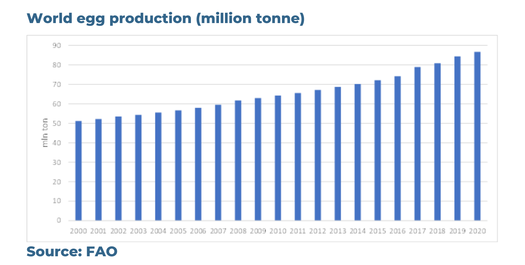 According to FAO data, egg production has steadily increased over the past two decades from around 51 million tonnes in 2000 to almost 87 million tonnes in 2020.